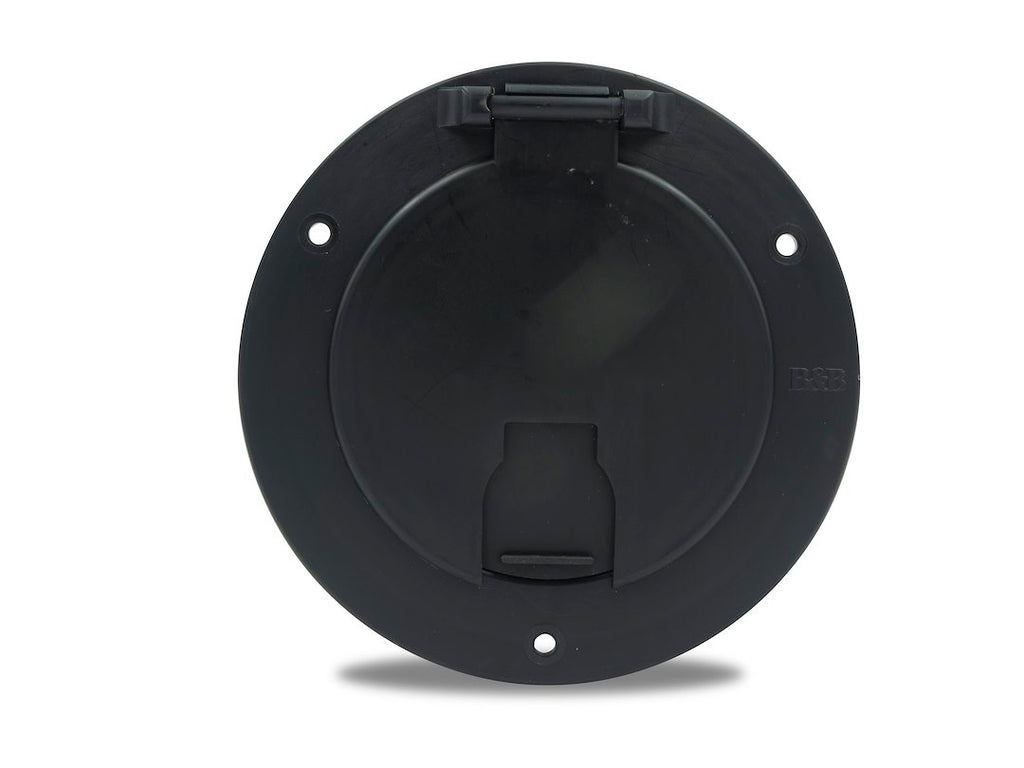 For Use With Up To 30 Amp/ 50 Amp Cords; Round; 5-1/8 Inch Diameter x 2-3/8 Inch Depth; 3-1/2 Inch Cutout Diameter; Black; With Back; With Installation Kit; B&B Cross Reference 541-3-A