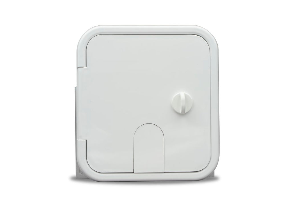 Electrical Hatch; 4-3/4 Inch Height x 4-1/4 Inch Width Cutout Dimension; 6-1/2 Inch Height x 6 Inch Width Outside Dimension x 3/8 Inch Collar Depth; Accepts Up To 30 Amp/ 50 Amp Cords; Polar White; Thumb Lock; UV And Impact Resistant; B&B Cross Reference MGD32-A