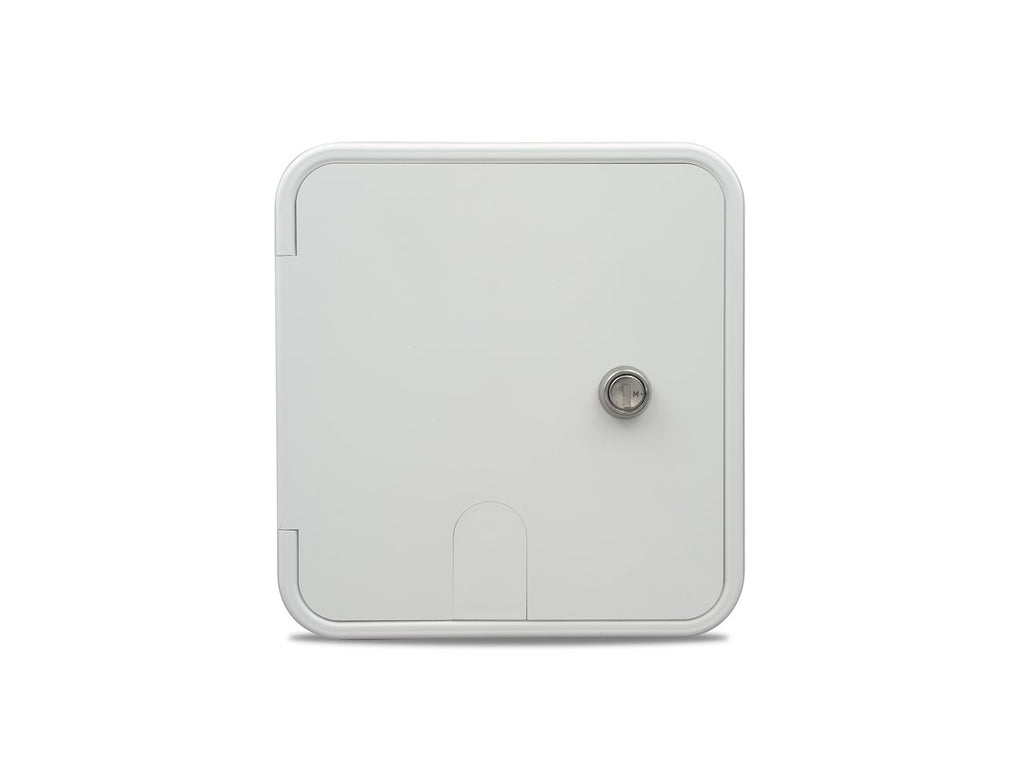 Electrical Hatch; 6-7/8 Inch Height x 6-3/8 Inch Width Cutout Dimension; 8-1/2 Inch Height x 8 Inch Width Outside Dimension x 1-1/8 Inch Collar Depth; Accepts Up To 30 Amp/ 50 Amp Cords; Polar White; Key Alike Lock; UV And Impact Resistant; B&B Cross Reference 22132-A