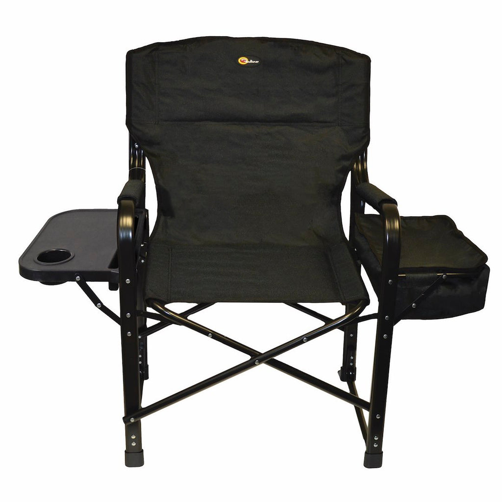 Director Chair; 37 Inch Height x 43.3 Inch Width x 21.25 Inch Depth When Open/ 37 Inch Height x 5.51 Inch Width x 21.25 Inch Depth When Folded; 300 Pound Weight Capacity; Foldable; Black; Steel Tubing With Polyester Fabric; Without Headrest; With 14 Inch Depth x 9.8 Inch Width x 5.5 Inch Height Cooler Bag/ Side Tray
