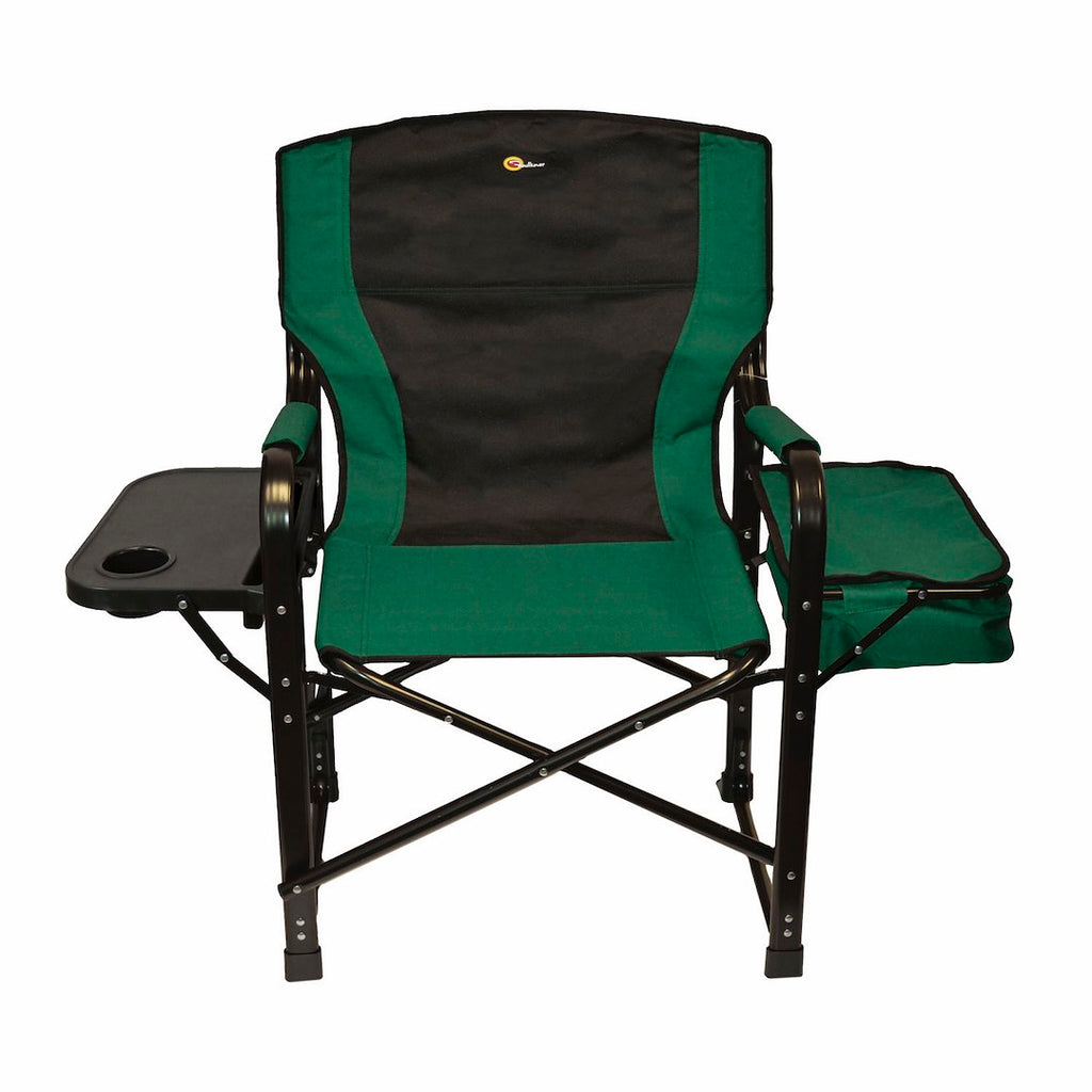 Director Chair; 37 Inch Height x 43.3 Inch Width x 21.25 Inch Depth When Open/ 37 Inch Height x 5.51 Inch Width x 21.25 Inch Depth When Folded; 300 Pound Weigh Capacity; Foldable; Green/ Black; Steel Tubing With Polyester Fabric; Without Headrest; With 14 Inch Depth x 9.8 Inch Width x 5.5 Inch Height Cooler Bag/ Side Tray
