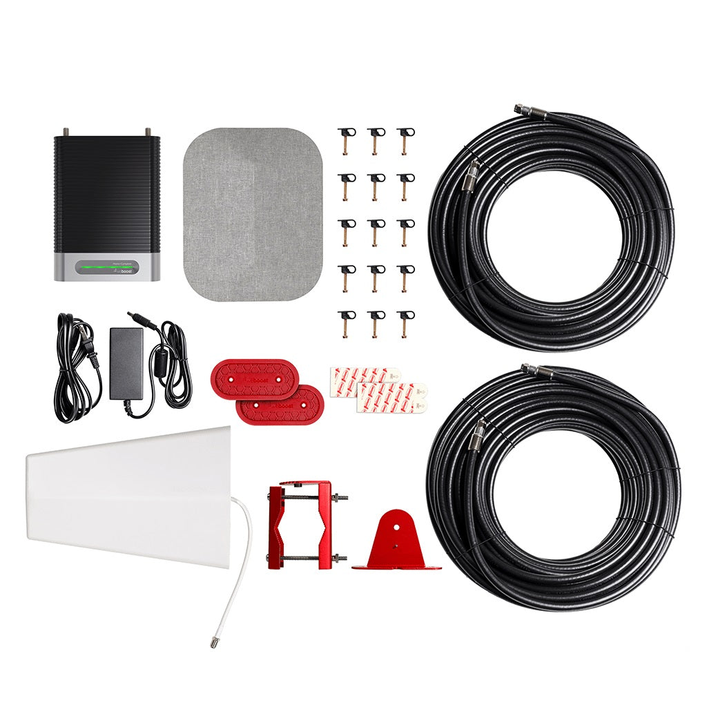 WE BOOST 470145 Use To Amplify The Cell Phone Signal In Your Home; Designed For Residential Usage; Compatible With Cell Phones/ Tablets/ Hotspots/ Cellular Connected Devices; Voice/ Text/ 4G Data; 72 decibels (dB) Maximum Gain; 700 MHz At Band 12 And 17/ 700 MHz At Band 13/ 850 MHz At Band 5/ 1700/2100 MHz At Band 4 And 1900 MHz At Band 25/ 2; Covers Up To 7500 Square Feet; 110 To 240 Volt AC/ 20 Watts; 8-1/4 Inch Height x 6 Inch Width x 2.4 Inch Length; With 4G Signal Amplifier/ 314445 Outside Directional Antenna/ 314440 Fabric Inside Panel Antenna/ 850023 Power Supply/ 951160 60 Foot And 75 Foot Black RG11 Cable/ Outside Antenna Mounting Bracket/ Wall Mount Brackets With Command Strips/ Cable Mounting Clips