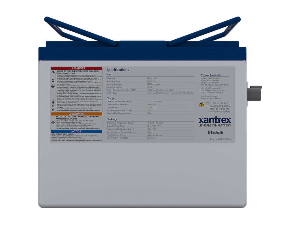 XANTREX LLC 883-0105-12 Group 27; 12 Volt DC; 105 Amp; Side Terminal; Lithium; 10.2 Inch Length x 6.6 Inch Width x 8.2 Inch Height; IP65 Rated For Marine Application; Bluetooth Connectivity; Internal Battery Management System (BMS); With 2 Foldout Carry Handles