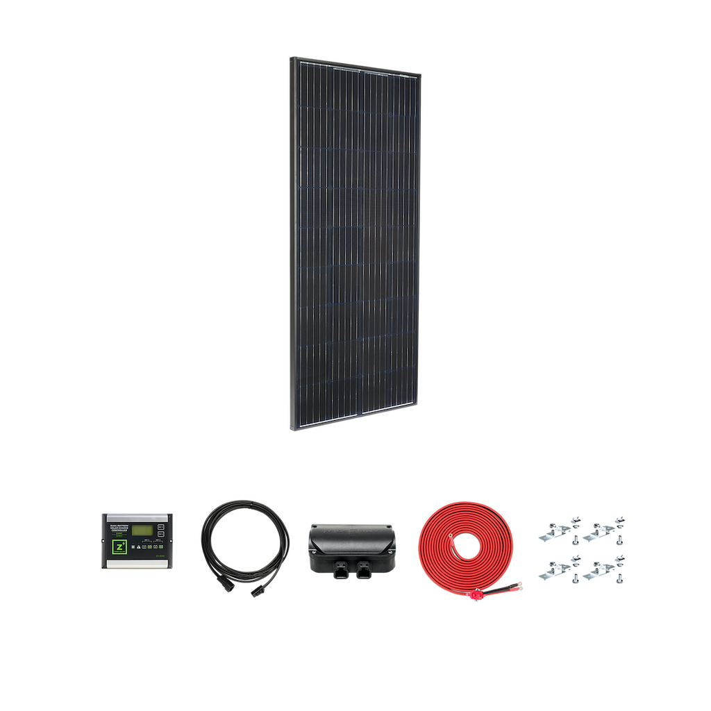 190 Watt; Monocrystalline; Black Frame And Cells; 58.3 Inch Length x 26.4 Inch Width x 1.5 Inch Depth; Bracket Mount; 40 Amp 5-Stage PWM Charge Controller; With Mounting Hardware/ Custom Pre-Terminated Wiring Harness/ Charge Controller/ 2-Port ATP Roof Cap