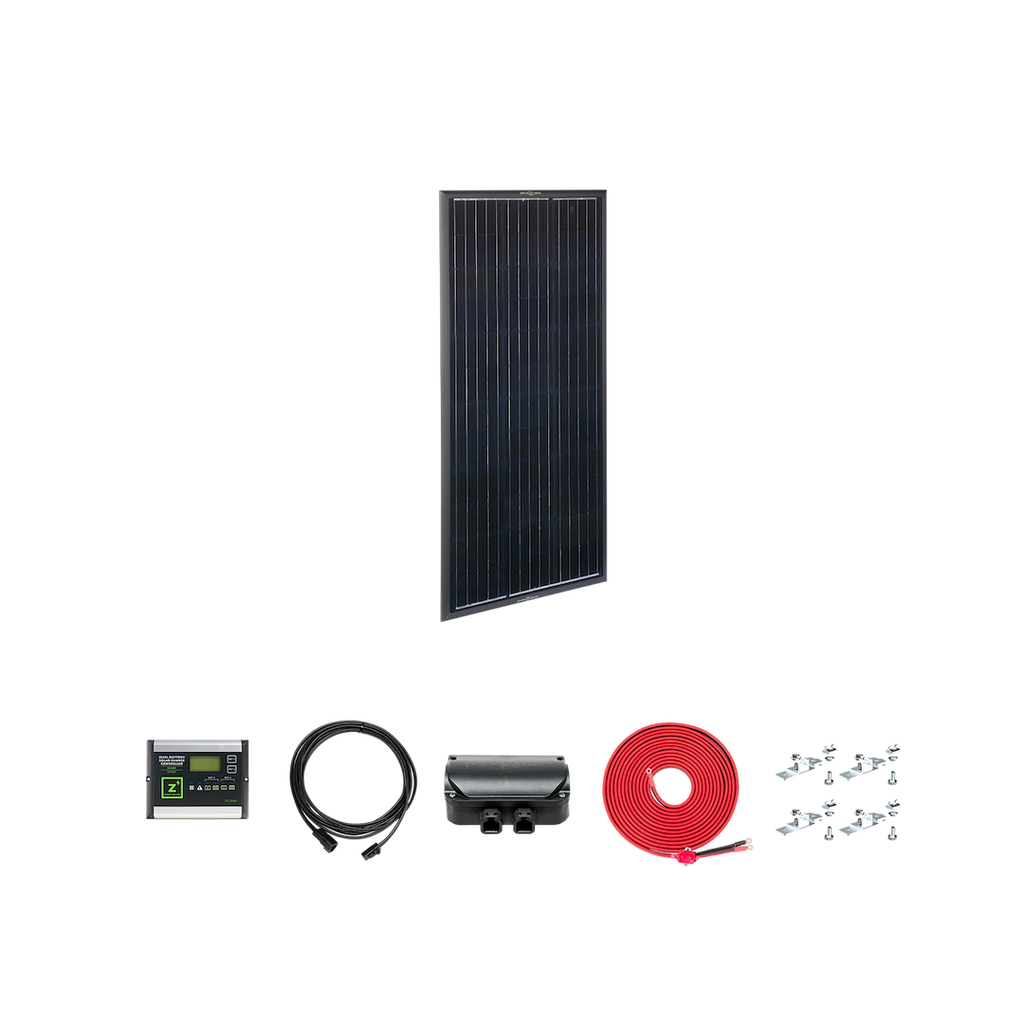 ZAMP SOLAR KIT1033 Hardwired Solar Kit; 100 Watt/ 5.01 Amp Charging Current; Black Frame And Cells; 43.6 Inch Length x 20.7 Inch Width x 0.67 Inch Depth; Bracket Mount; 40 Amp PWM Charge Controller; With Mounting Hardware/ Charge Controller/ 10 Foot Length ATP To ATP Wiring Extension/ 2 Port ATP Solar Roof Cap/ Wiring Harness